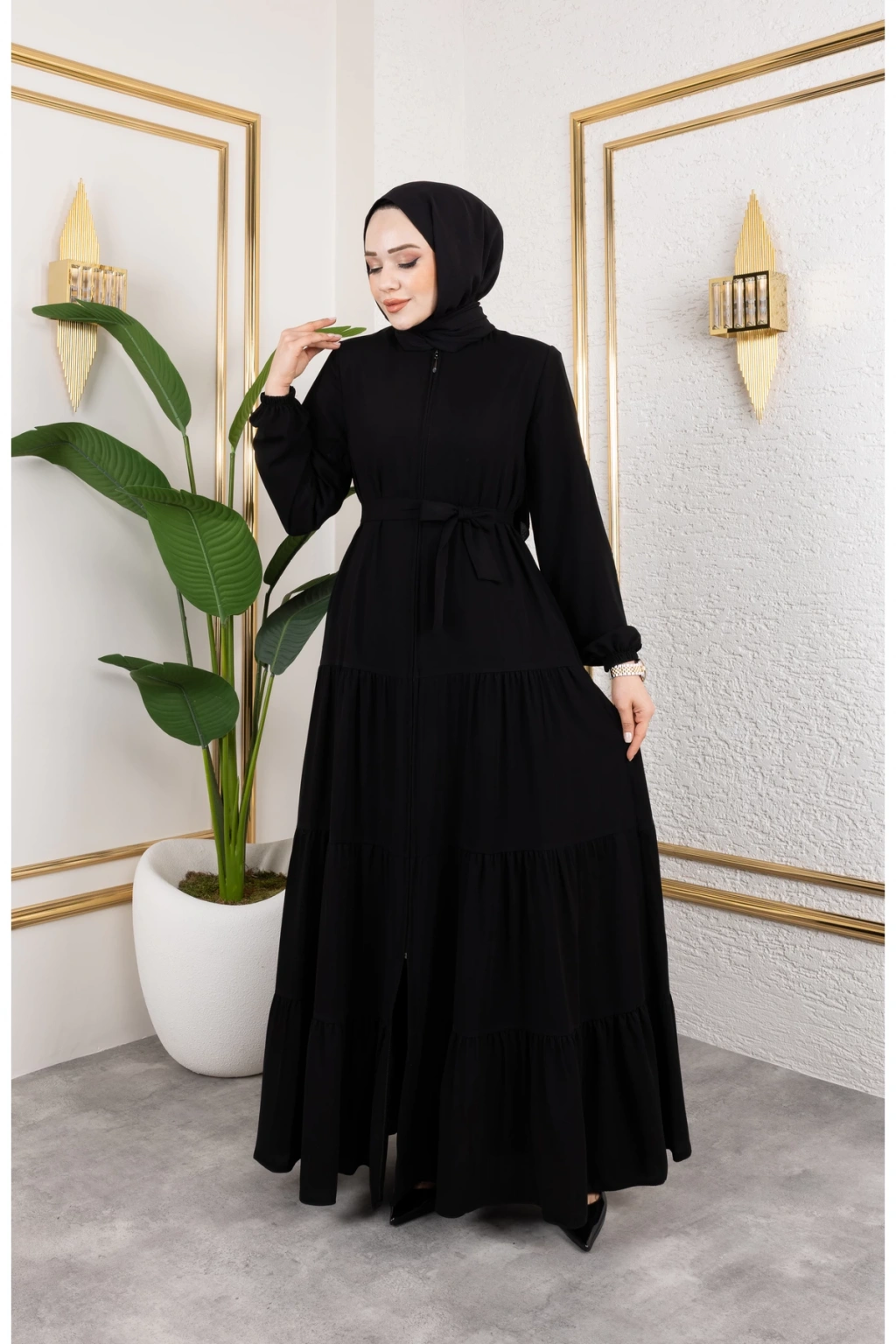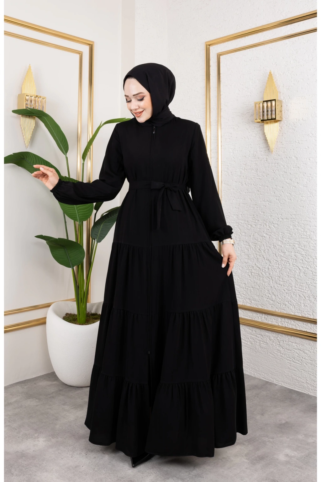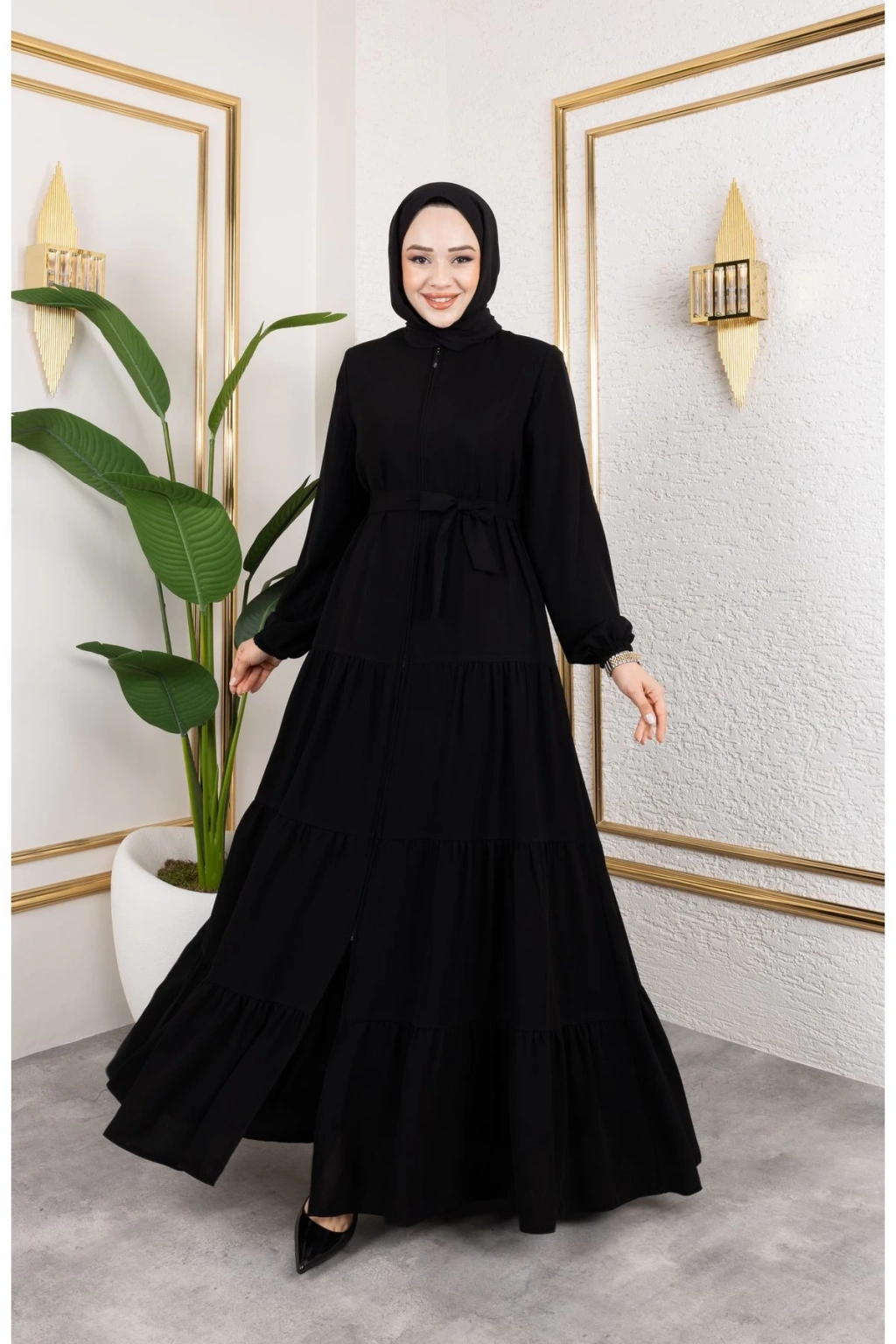 Ürünümüzün kumaşı medine ipeğidir dökümlüdür Önden gizli fermuarlıdır.; 3 Kat büzgü detaylıdır Ürün b oyu 145 cm'dir.; Fermuar boyu:100cm'dir Ürünümüzü daha uzun kullanabilmeniz için sürtünmelerden, zincirli ve taşlı aksesuarlardan koruyunuz.