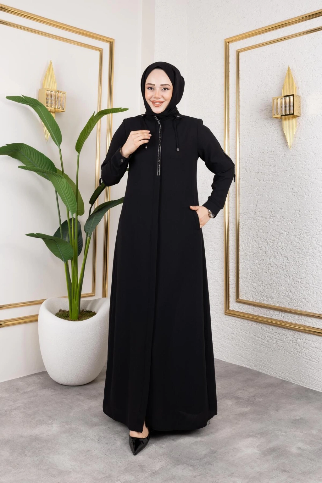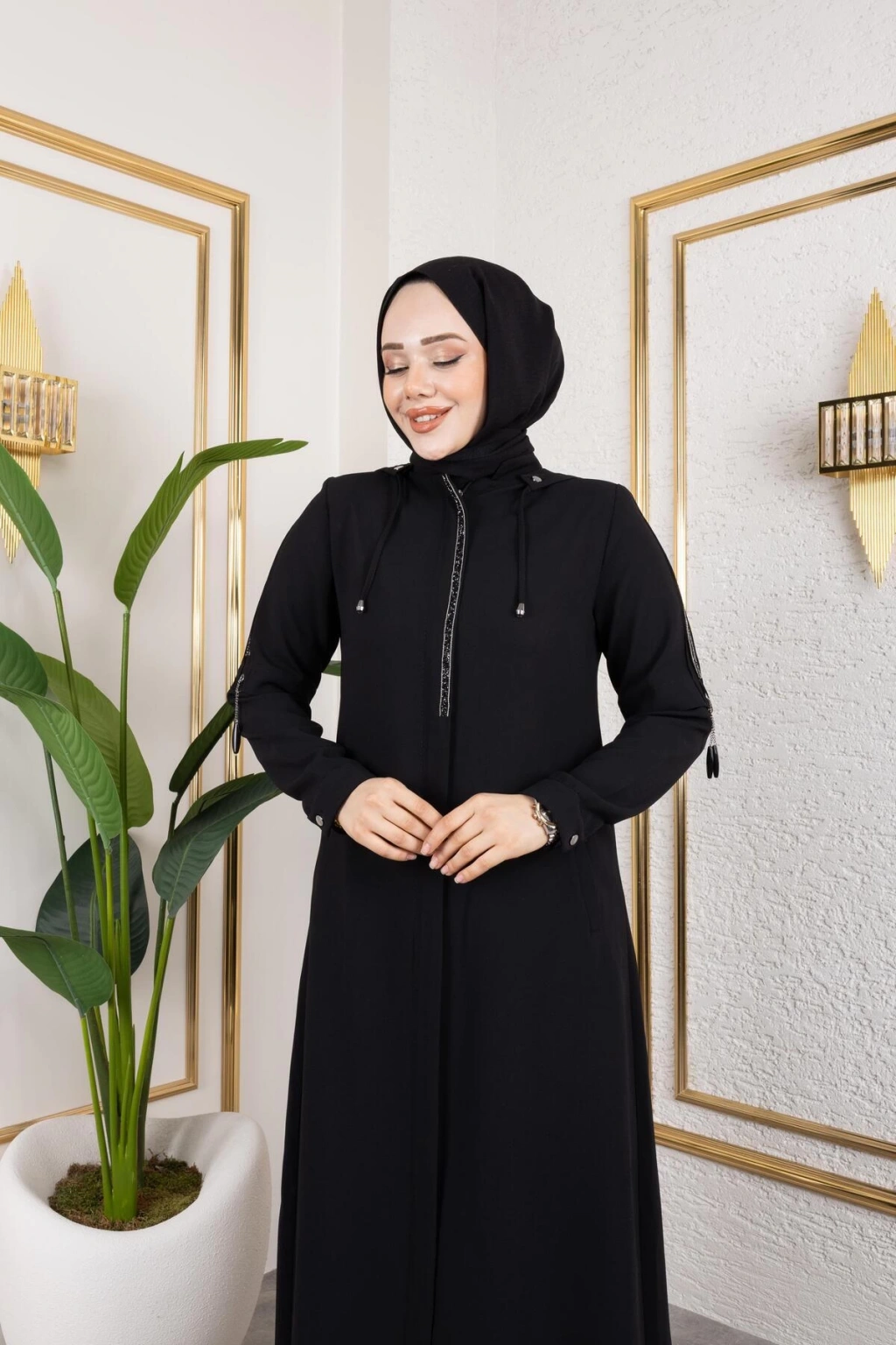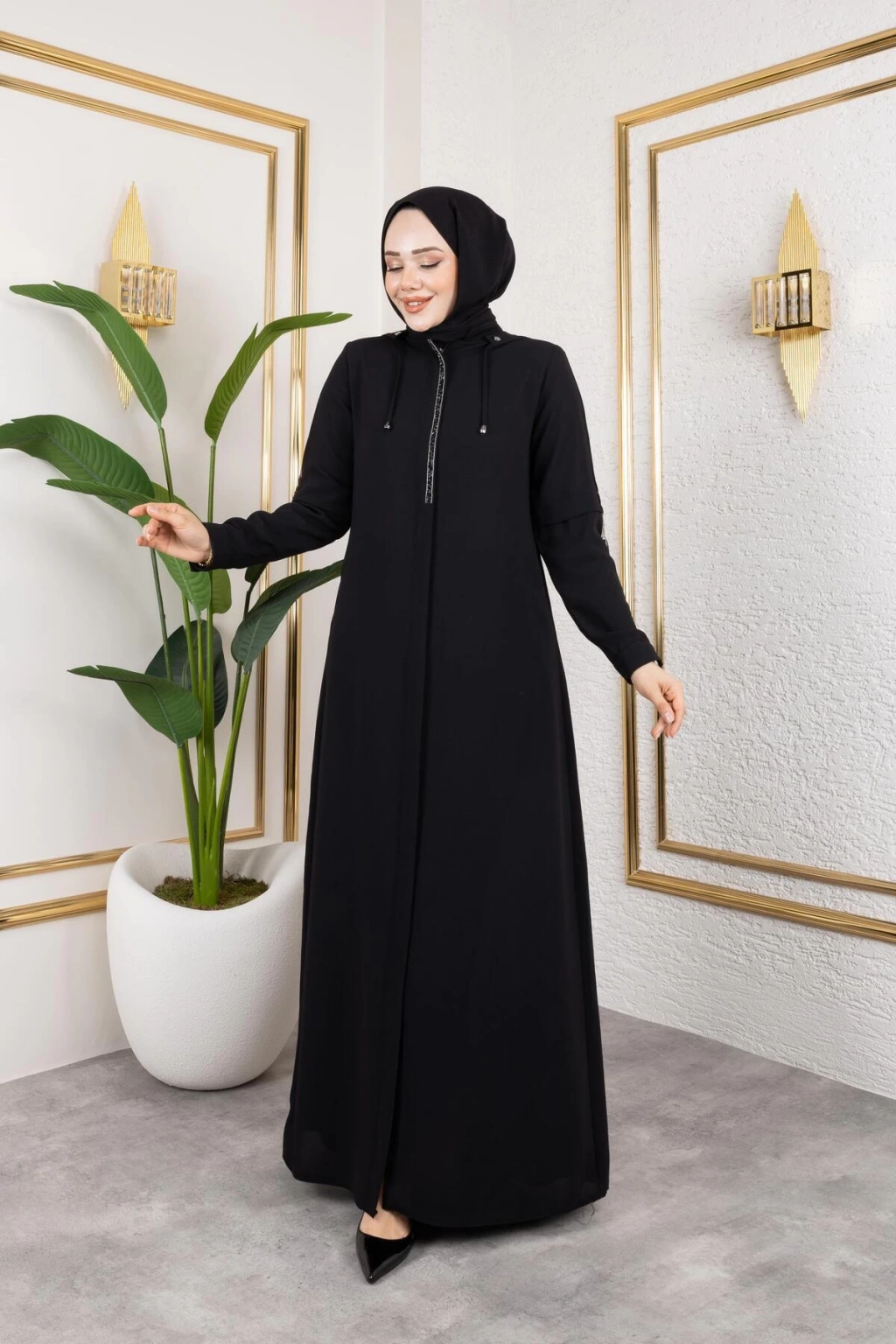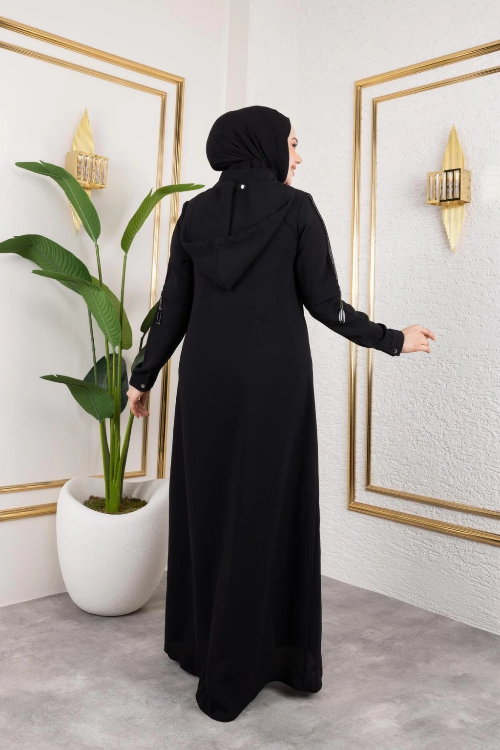 Ürünümüzün kumaşı petek kreptir.; ; Şerit taş detaylıdır.; ; 58 bedene kadar beden seçeneği mevcuttur.; ; Ürünümüzün boy 145 cm'dir.; ; Çıkarılabilir seyyar kapüşonludur.; ; Ürünümüzü daha uzun kullanabilmeniz için sürtünmelerden, zincirli ve taşlı aksesuarlardan koruyunuz.