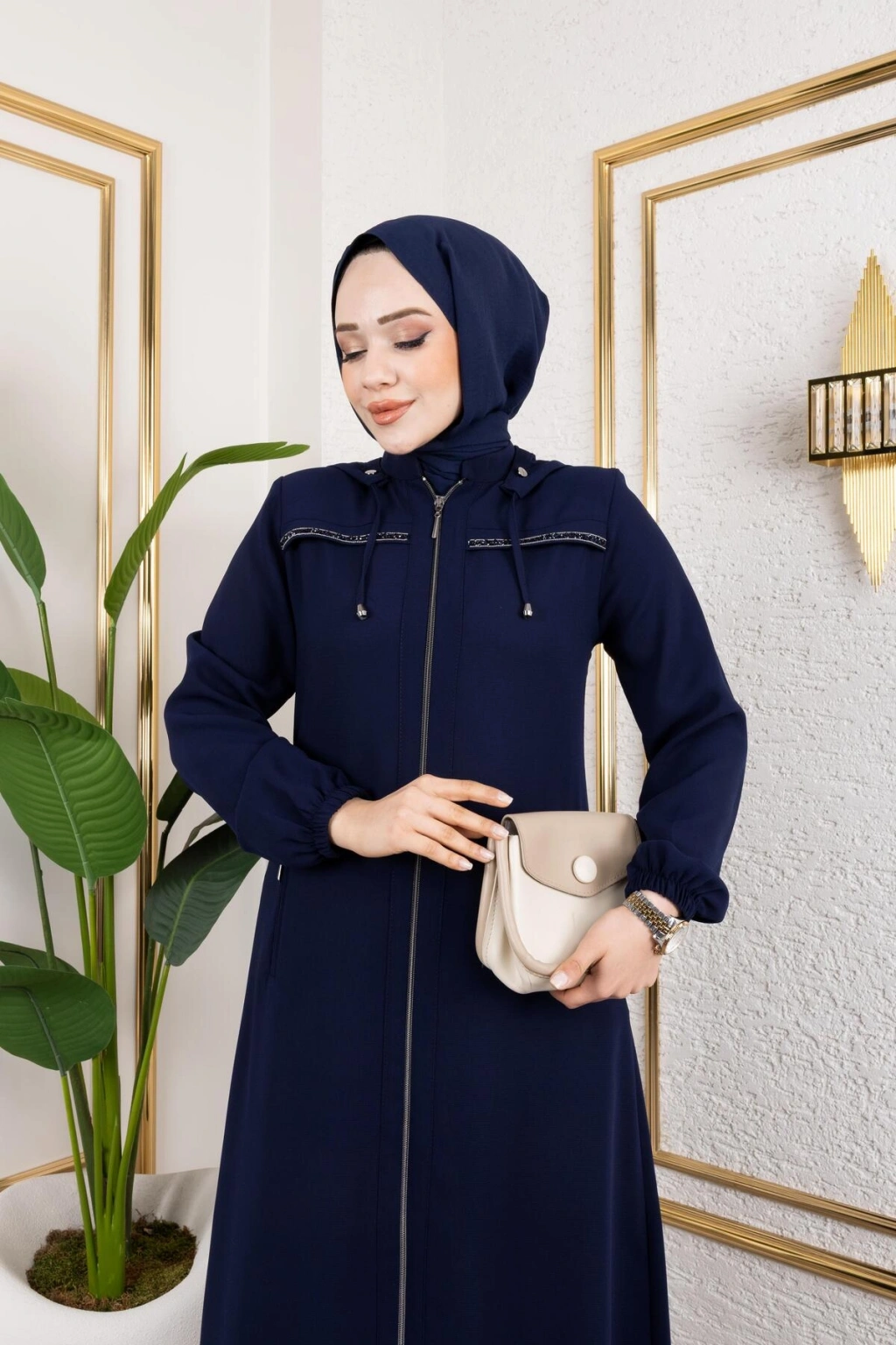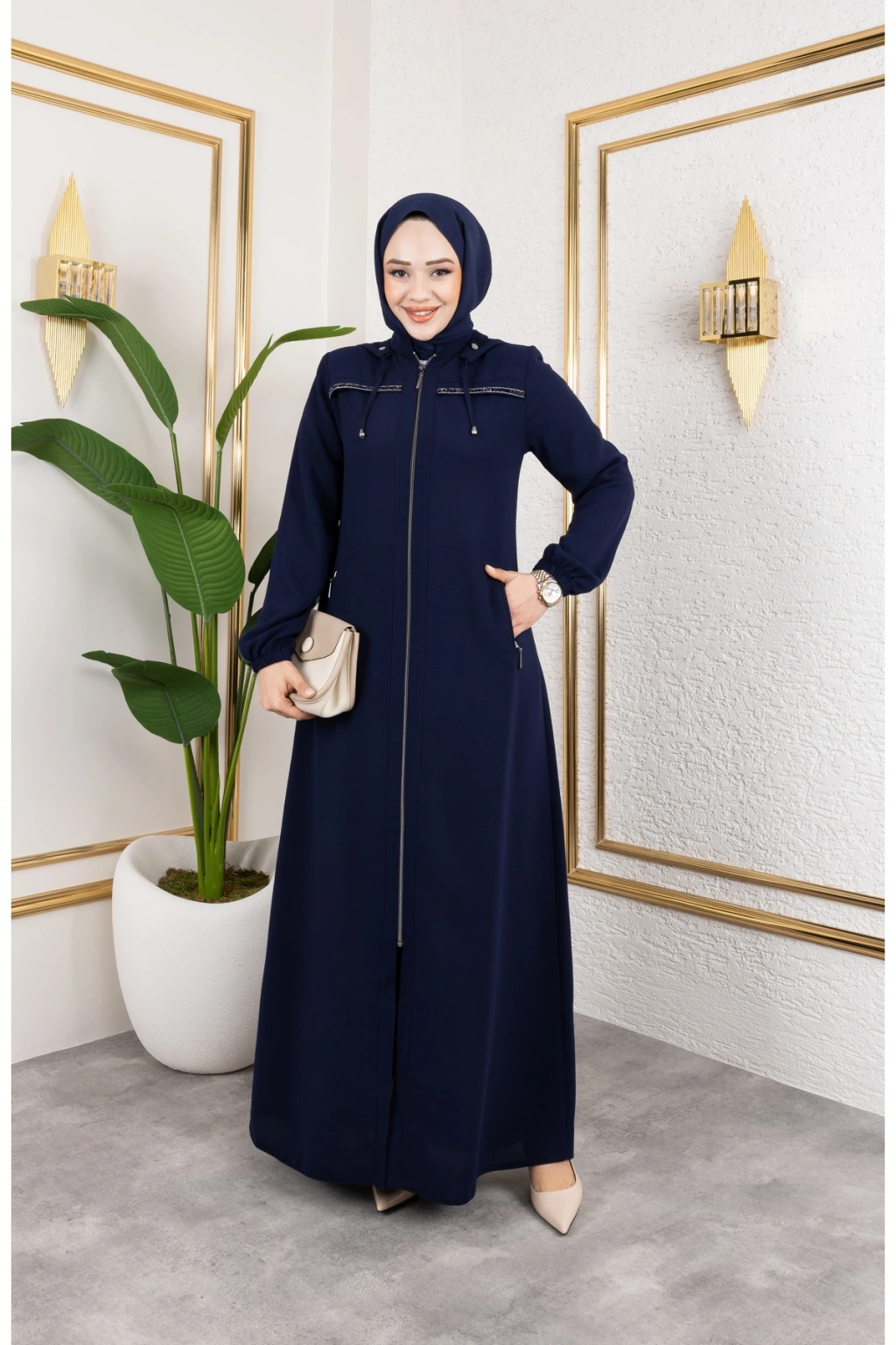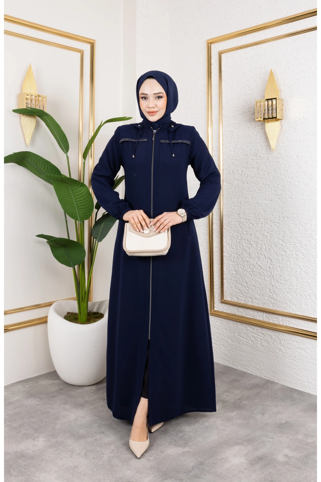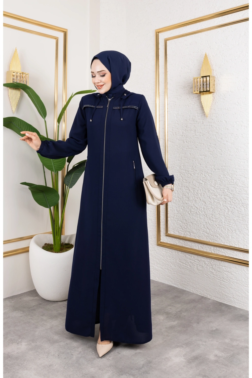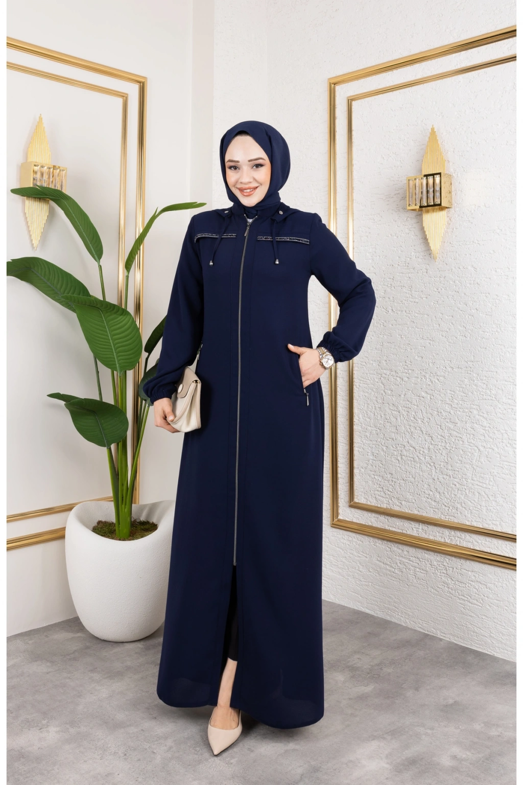 Ürünümüzün kumaşı petek kreptir.; ; Şerit taş detaylıdır.; ; Ürünümüzün boy 145 cm'dir.; ; Fermuar boyu 100cm'dir ; Çıkarılabilir seyyar kapüşonludur.; ; Ürünümüzü daha uzun kullanabilmeniz için sürtünmelerden, zincirli ve taşlı aksesuarlardan koruyunuz.