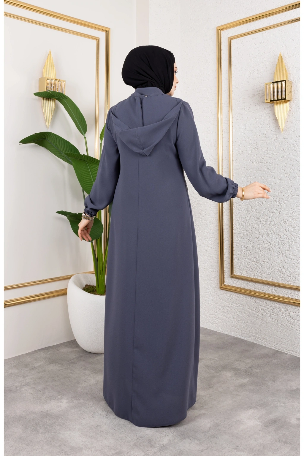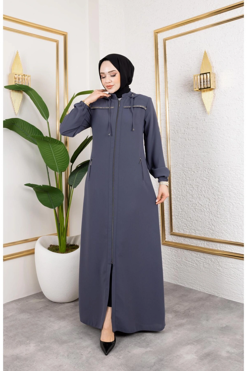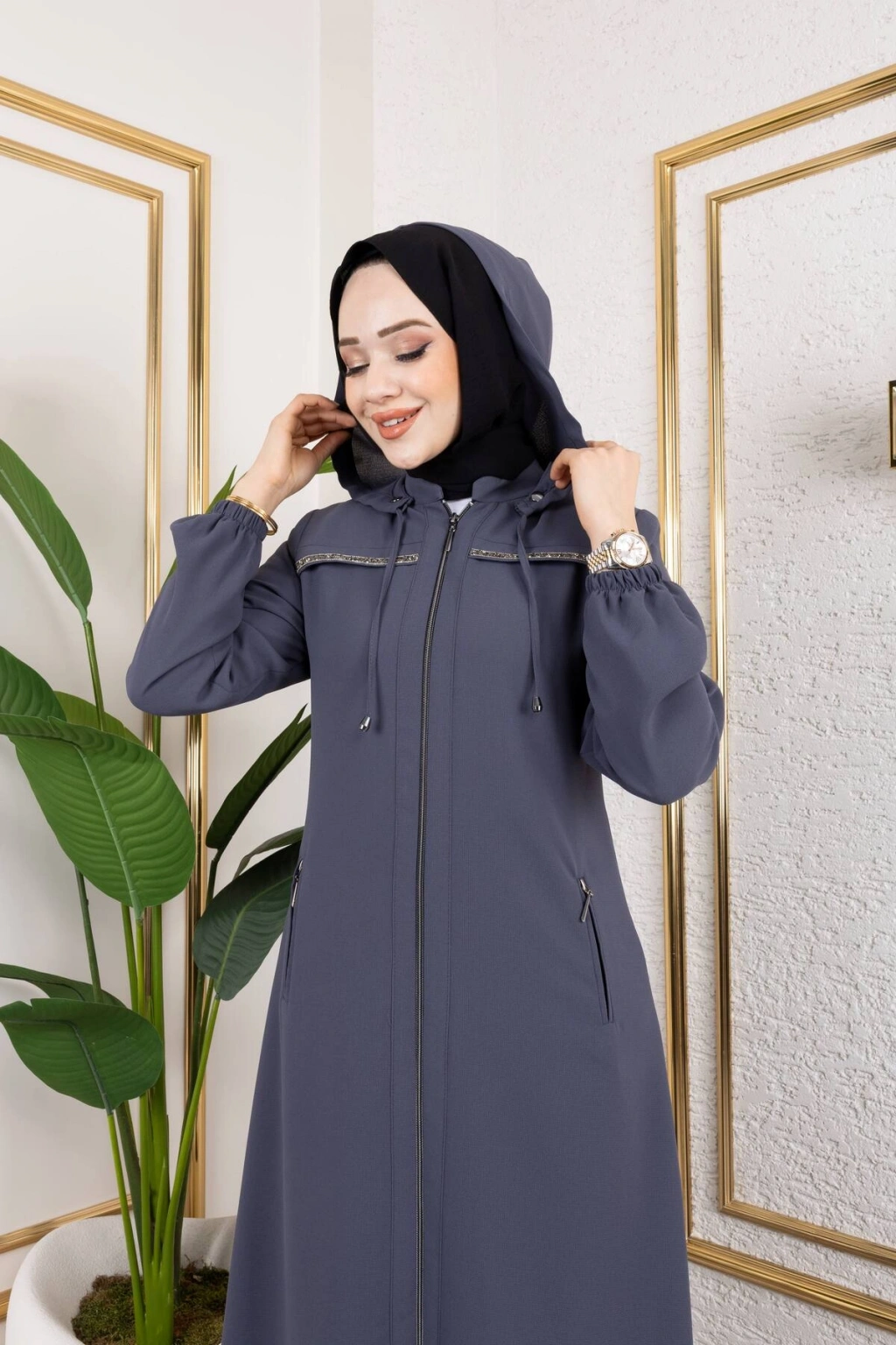 Ürünümüzün kumaşı petek kreptir.; ; Şerit taş detaylıdır.; ; Ürünümüzün boy 145 cm'dir.; ; Fermuar boyu 100cm'dir ; Çıkarılabilir seyyar kapüşonludur.; ; Ürünümüzü daha uzun kullanabilmeniz için sürtünmelerden, zincirli ve taşlı aksesuarlardan koruyunuz.