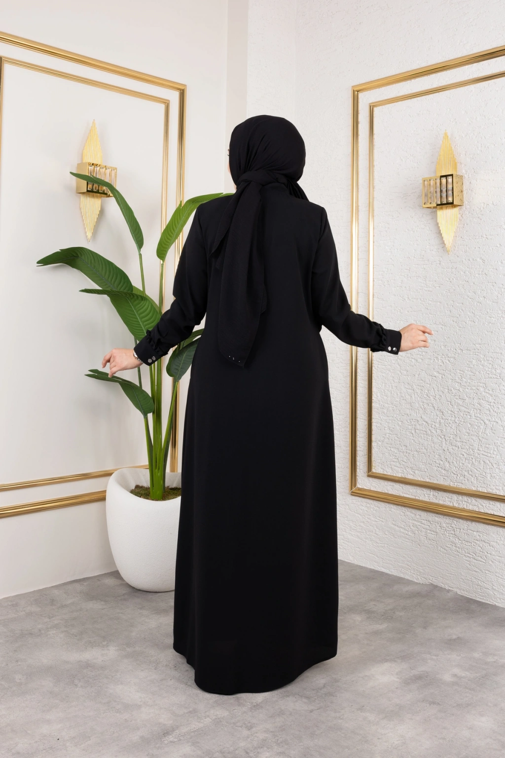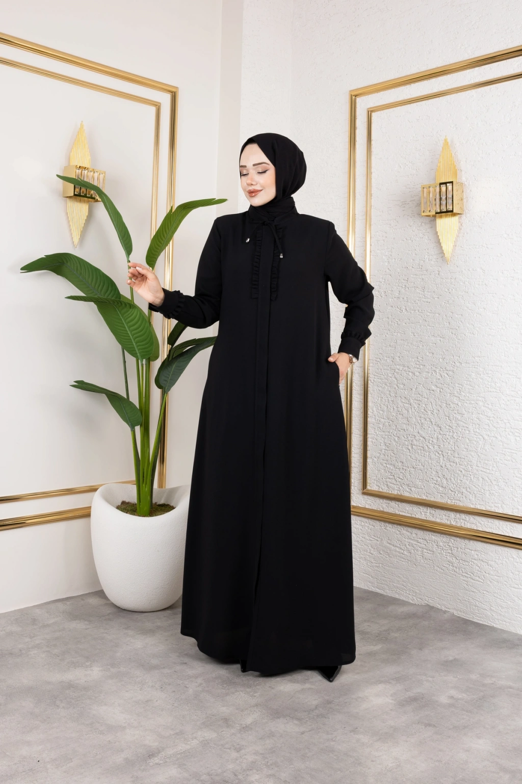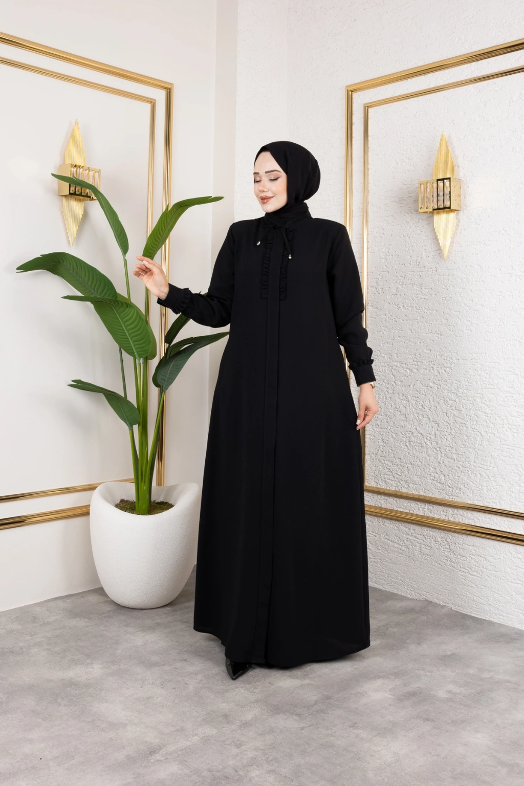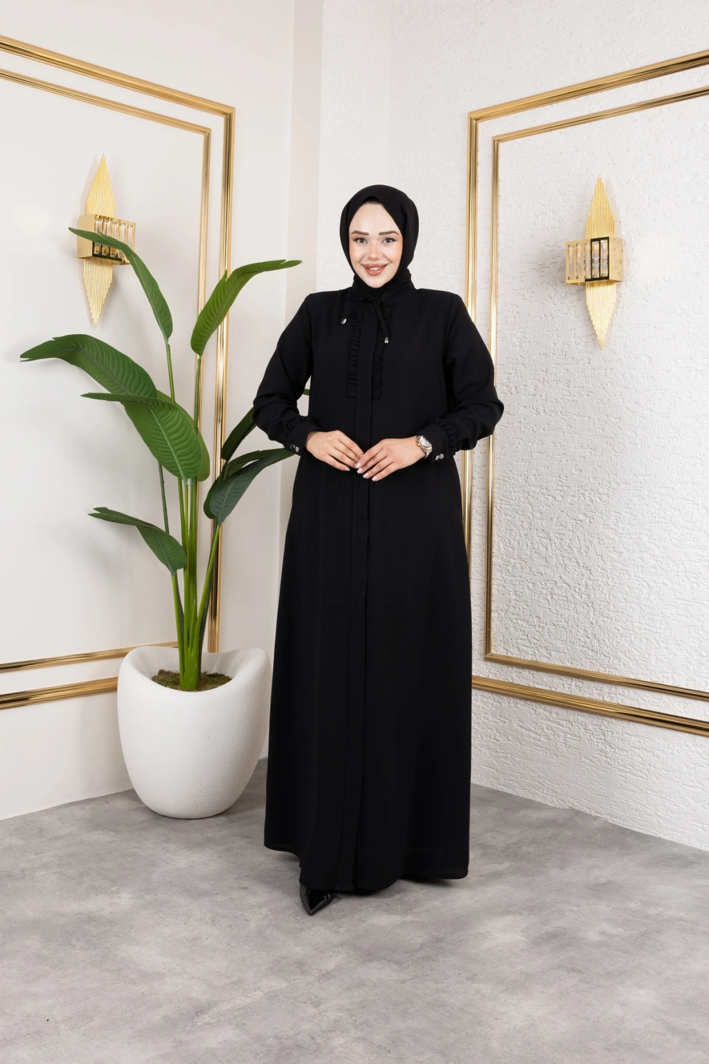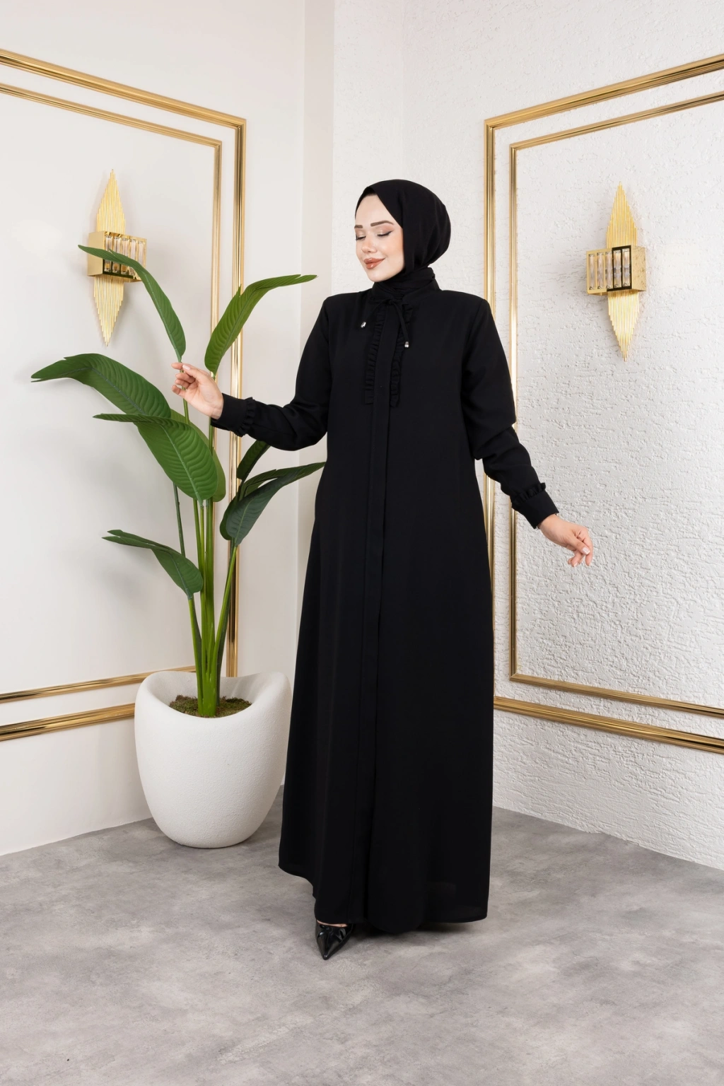 Ürünümüzün kumaşı petek kreptir.; Göğüs ve manşet kısmında fırfır detayları mevcuttur Önden patlı ve gizli fermuarlıdır Ürünümüzün boy 145 cm'dir.; Yakada biye detayı mevcuttur Ürünümüzü daha uzun kullanabilmeniz için sürtünmelerden, zincirli ve taşlı aksesuarlardan koruyunuz.