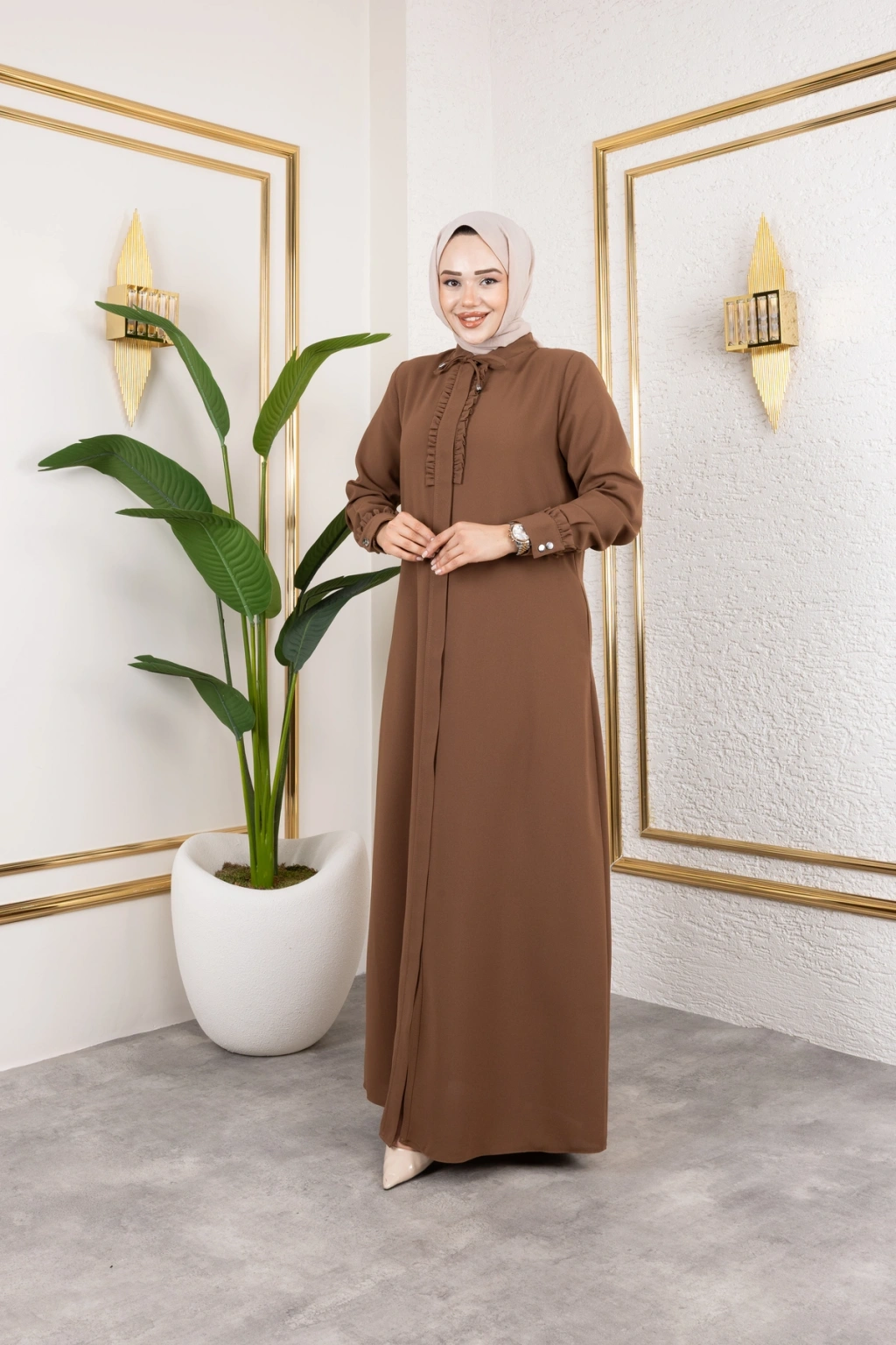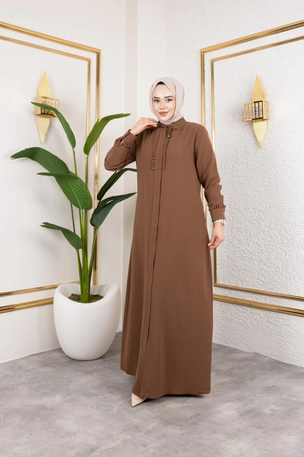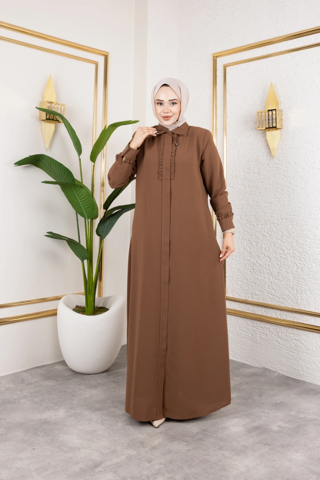 Ürünümüzün kumaşı petek kreptir.; Göğüs ve manşet kısmında fırfır detayları mevcuttur Önden patlı ve gizli fermuarlıdır Ürünümüzün boy 145 cm'dir.; Yakada biye detayı mevcuttur Ürünümüzü daha uzun kullanabilmeniz için sürtünmelerden, zincirli ve taşlı aksesuarlardan koruyunuz.