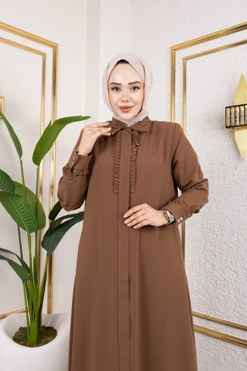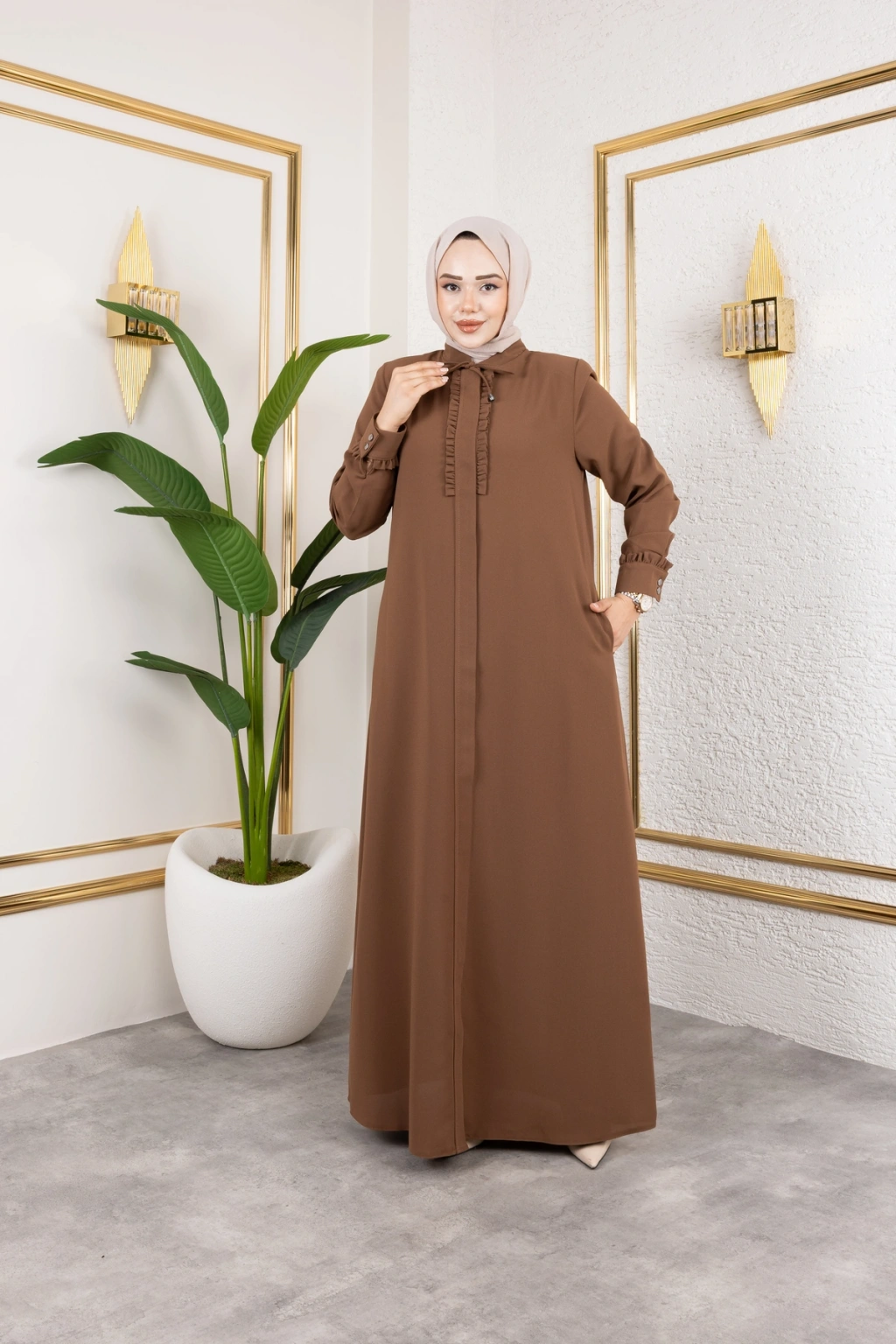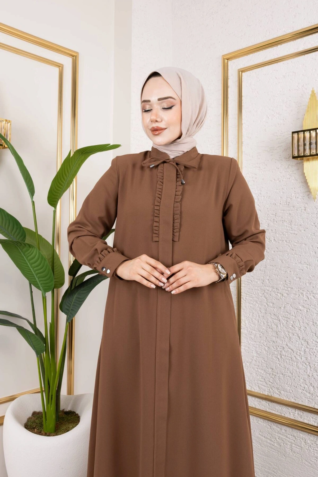 Ürünümüzün kumaşı petek kreptir.; Göğüs ve manşet kısmında fırfır detayları mevcuttur Önden patlı ve gizli fermuarlıdır Ürünümüzün boy 145 cm'dir.; Yakada biye detayı mevcuttur Ürünümüzü daha uzun kullanabilmeniz için sürtünmelerden, zincirli ve taşlı aksesuarlardan koruyunuz.