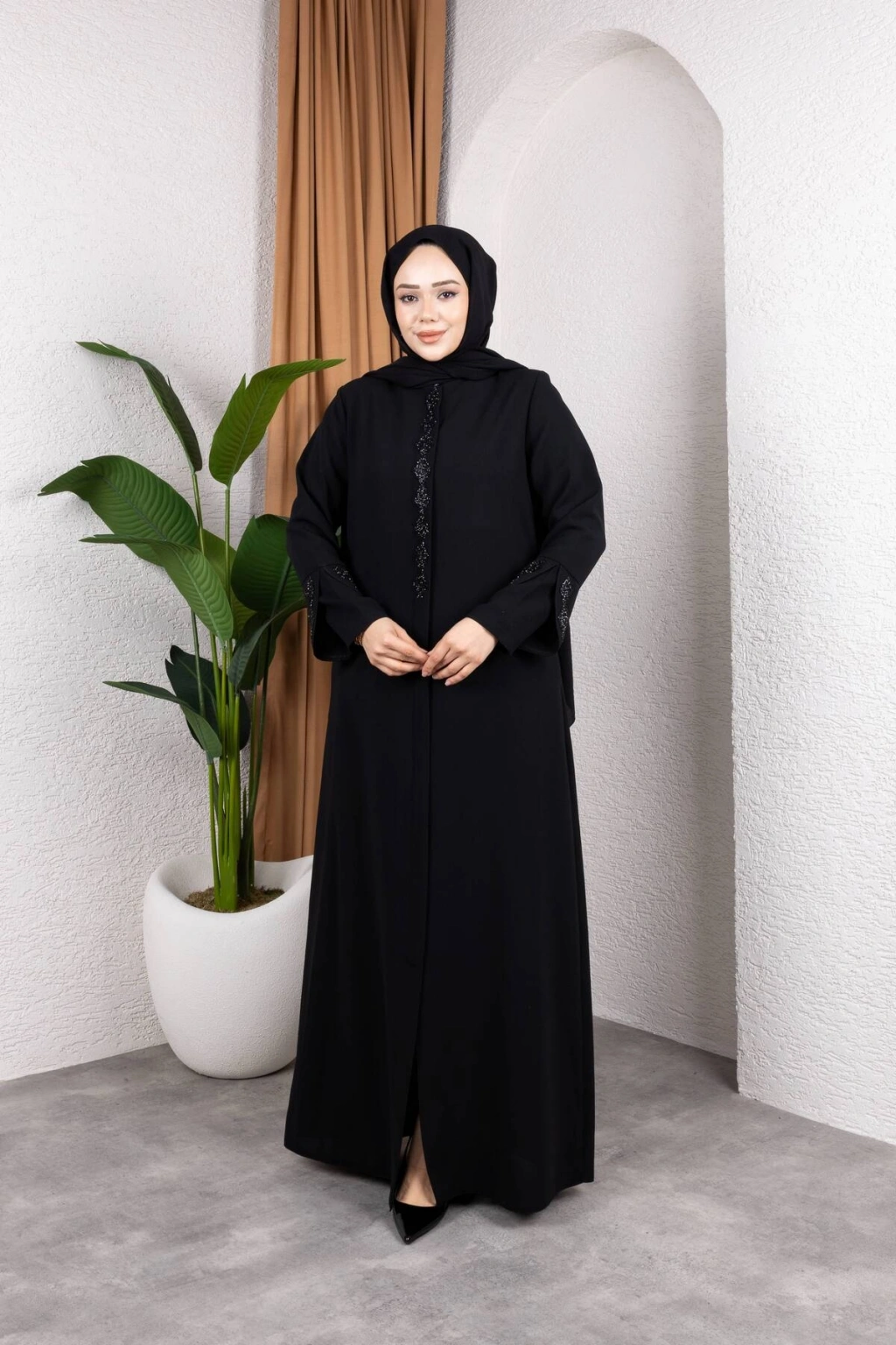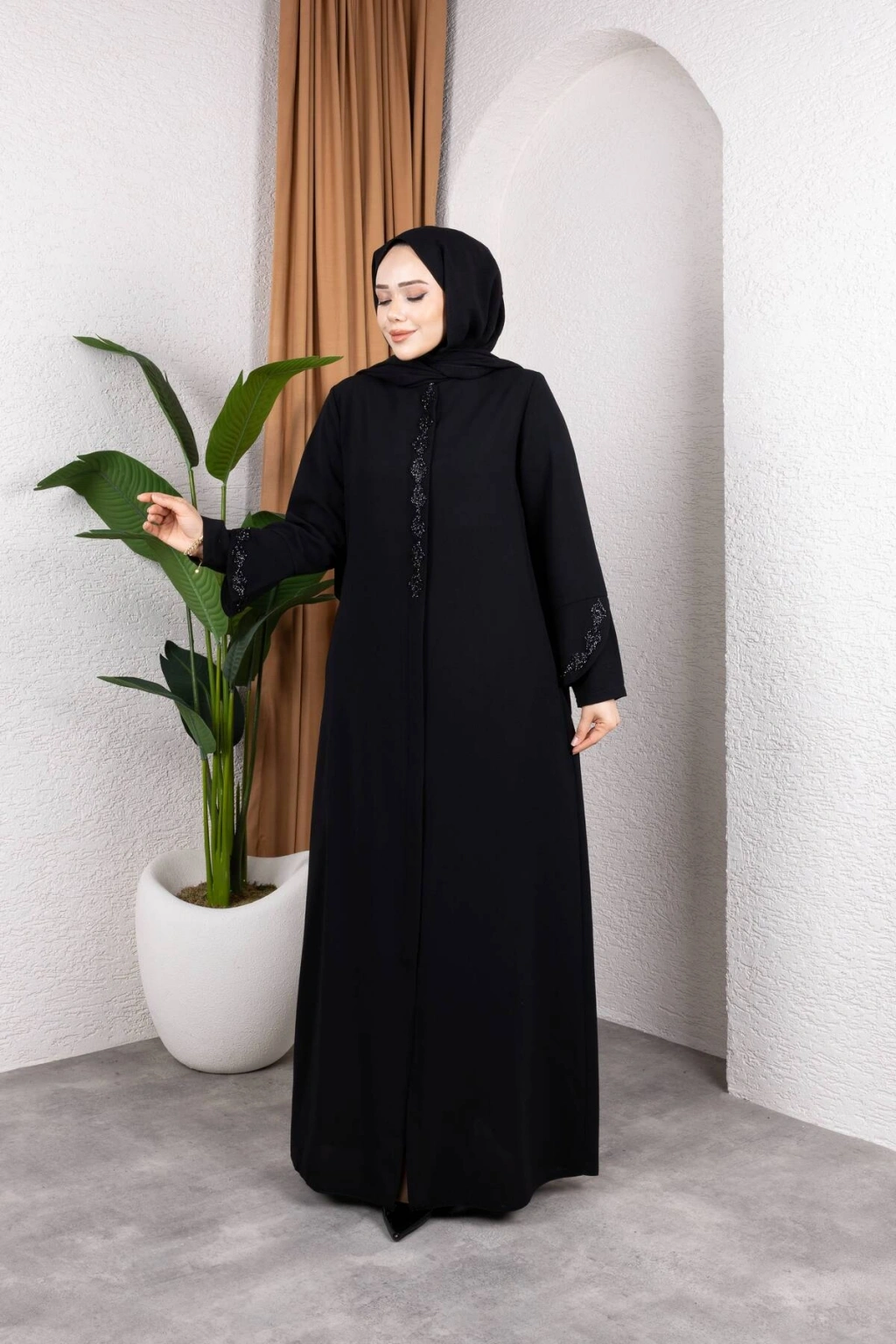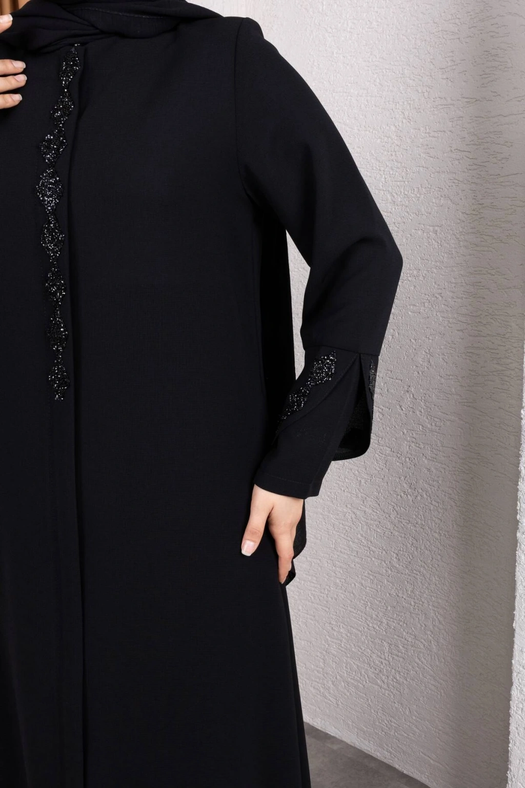 Ürünümüzün kumaşı petek kreptir.; ; Göğüs ve kol baklava desen taş detaylıdır.; ; 52 bedene kadar beden seçeneği mevcuttur.; ; Ürünümüzün boy 145 cm'dir.; ; Ürünümüzü daha uzun kullanabilmeniz için sürtünmelerden, zincirli ve taşlı aksesuarlardan koruyunuz.
